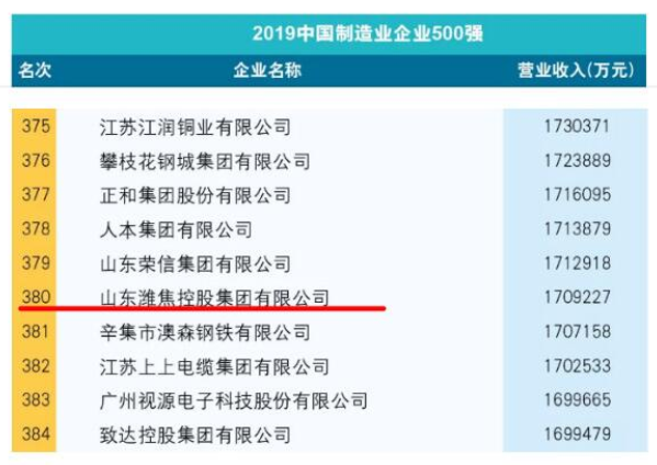 近日,在2019中國500強企業高峰論壇上,中國企業聯合會、中國企業家協會聯合發布了“2019中國制造業企業500強”榜單,山東濰焦控股集團有限公司再次榮登榜單,位列中國制造業企業500強第380位,比去年提高了一個位次。